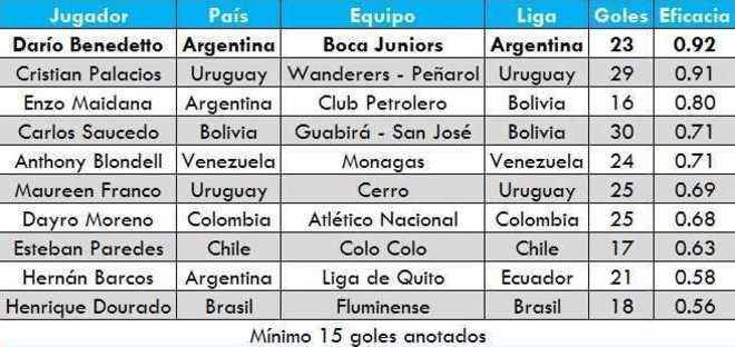Darío Benedetto tuvo un 2017 espectacular, aunque sobre el final se vio opacado por la rotura de ligamentos que lo sacará de los primeros meses del año próximo. El Pipa fue figura de Boca y se cansó de hacer goles: anotó 23 en 25 partidos con el Xeneize y alcanzó un promedio de 0.92 gritos por partido jugado, el más alto de Sudamérica.