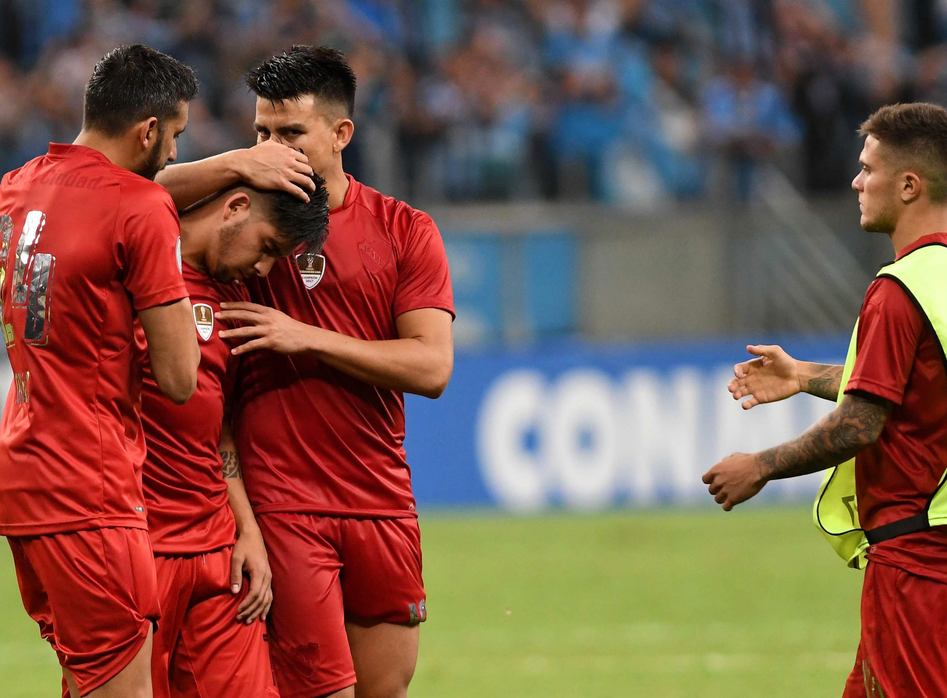 Final. El arquero de Gremio le atajó el penal y el desconsolado delantero del “Rojo” recibe el apoyo de sus compañeros.