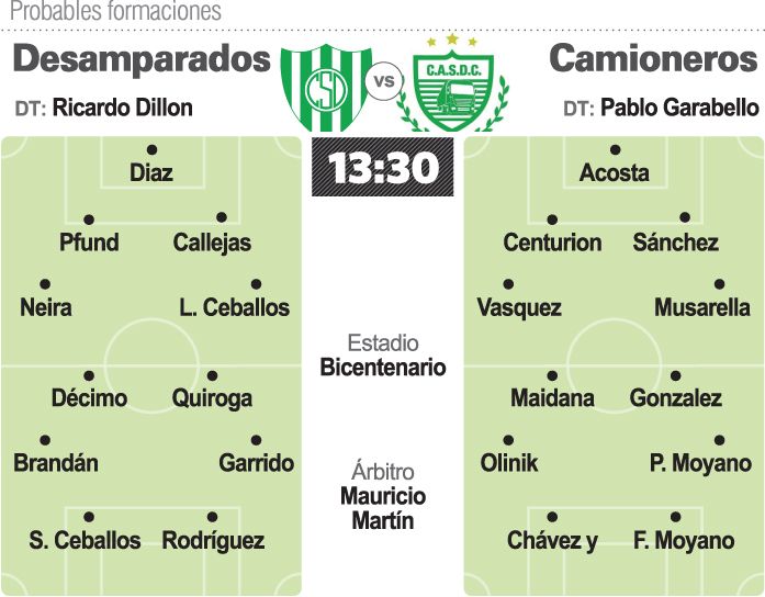 En un presente complejo, donde las urgencias están marcando el pulso en cada día de Sportivo Desamparados, el equipo de Ricardo Dillon intentará volver a ganar tras varias fechas recibiendo al ascendente Camioneros que viene de ganar y llega con otro perfil. Para Desamparados es fundamental ganar, casi que elemental para sostener las esperanzas de quedarse en la categoría aunque resten por disputar 27 puntos. Es el momento de hacerlo como para romper con ese bloqueo que tanto lo condiciona y no le permite salir de la última posición. Queda mucho pero debe empezar a cosechar y hoy, aunque logre el triunfo seguirá en zona de descenso. En lo futbolístico y después de la fecha libre que ya cumplió en la jornada anterior, Desamparados presentará solo un cambio y será en el medio, donde Nicolás Quiroga reemplazará a Javier Pereyra en una de las plazas centrales del mediocampo. Así, el Puyutano irá con Jairo Díaz en el arco, Neira, Pfund, Callejas y Lucas Ceballos completará el fondo, mientras que en el mediocampo estarán Brandán, Décimo, Quiroga y Garrido, quedando en el ataque Santiago Ceballos y Bruno Rodríguez.