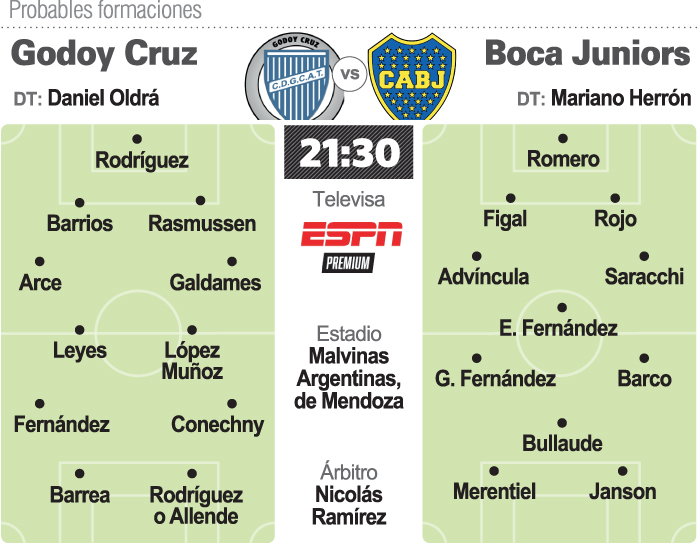 En Boca, la intención de Herrón es repetir la formación que perdió con Estudiantes, en un partido que le quedó incomodo por la prematura expulsión del lateral uruguayo Marcelo Saracchi cuando apenas se habían jugado 14 minutos de la primera etapa.