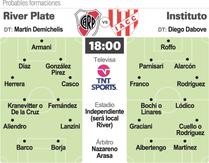 En Instituto la duda estaría en la zona media entre Roberto Bochi o Nicolás Linares (sufre un traumatismo en un tobillo) y en la ofensiva entre Lucas Albertengo y Santiago Rodríguez.