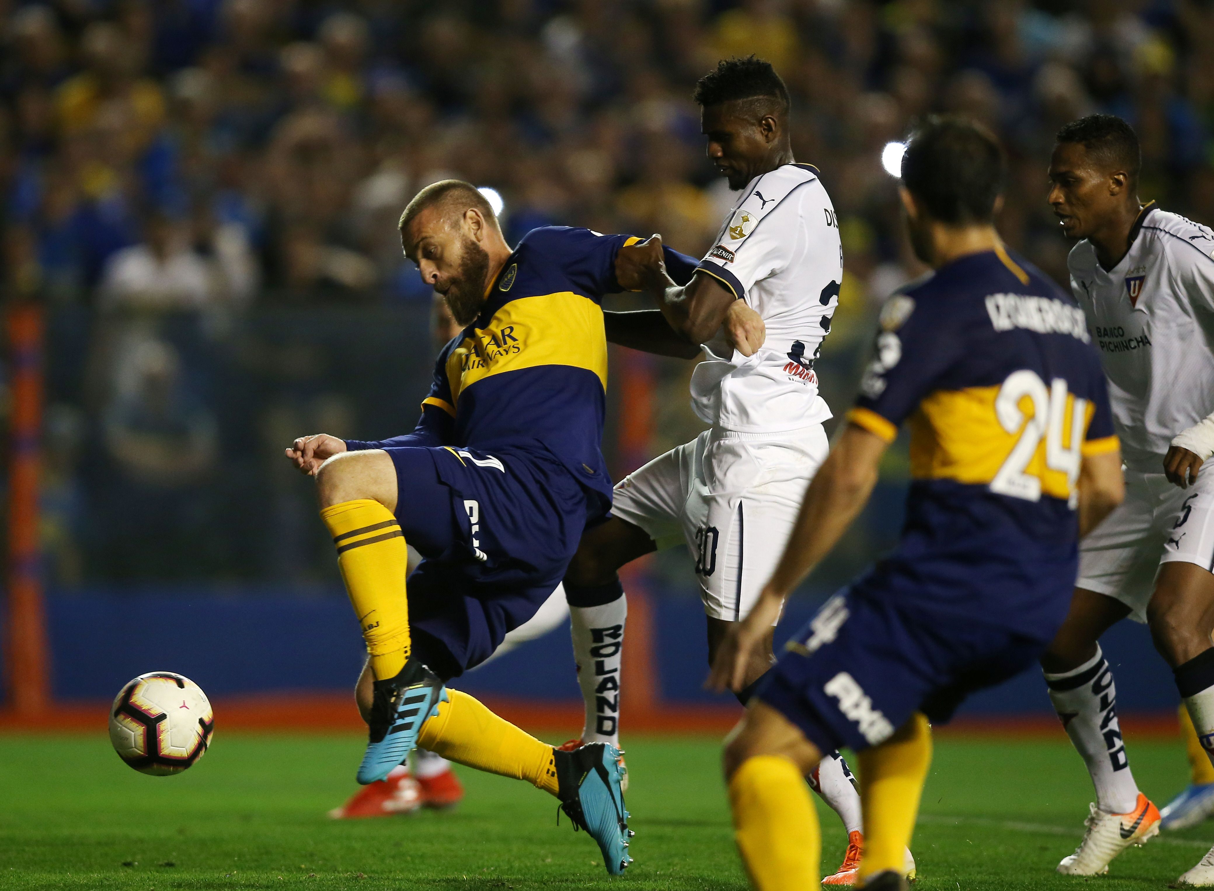 Sin embargo, le costó caro el pase a semi: Alfaro dispuso al elenco titular y padeció las lesiones de Eduardo Salvio y Ramón Ábila, a cuatro días del partido ante River por la Superliga. El Xeneize salió a jugar como si en la ida hubiese terminado 0-0. Concentrado, con ambición, generando peligro desde el inicio. La diferencia de jerarquía se pudo advertir también en el llano, ante un Liga que sólo atinó a tapar baches. Recién a los 19 Liga llegó a fondo y pudo anotar: Boca defendió en línea, Ayoví se filtró ante un pelotazo y, ante la salida de Andrada, remató ancho.