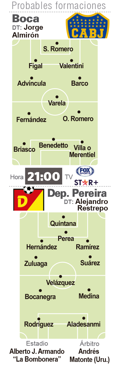 Boca Juniors recibirá hoy a Deportivo Pereira, de Colombia, en el primer partido de Jorge Almirón por la Copa Libertadores, con la necesidad de ganar para cortar la racha negativa en la Bombonera. El partido correspondiente a la segunda fecha del grupo F se jugará a las 21, con arbitraje del uruguayo Andrés Matonte y transmisión de Fox Sports y Star+. Luego del empate sin goles en Venezuela contra Monagas en el debut, el "xeneize" se presenta ante su gente en medio de la crisis futbolística con la obligación de ganar.