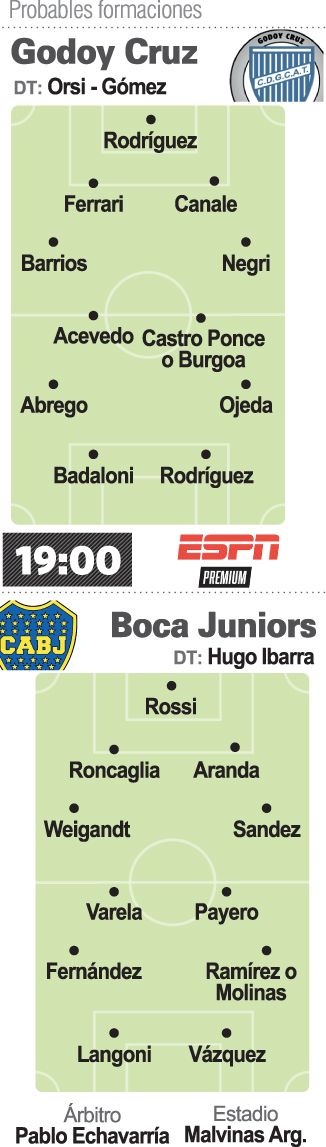 Boca Juniors, con su poderío afectado por 10 bajas, algunas sensibles, visitará hoy a Godoy Cruz de Mendoza en el inicio de la fecha 21 de la Liga Profesional de Fútbol (LPF), con la misión de maquillar esas ausencias y quedarse con tres puntos para alcanzar la cima. El encuentro se jugará a partir de las 19 en el estadio Malvinas Argentinas, en Mendoza, será arbitrado por Pablo Echavarría y televisado por ESPN Premium.