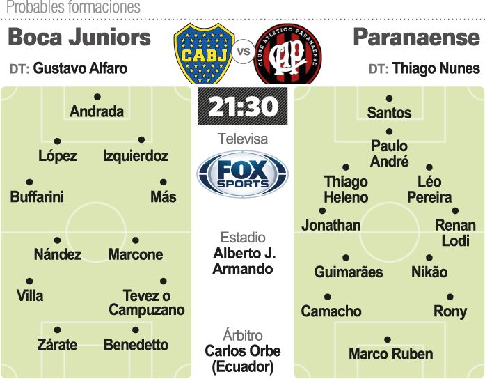 Boca Juniors recibirá hoy a Atlético Paranaense, de Brasil, con la misión de quedarse con una victoria que le permita adueñarse del primer puesto del Grupo G de la Copa Libertadores de América, en un partido válido por la sexta y última fecha. El encuentro se jugará a partir de las 21.30 en "La Bombonera" (televisado por Facebook y Fox Sports).