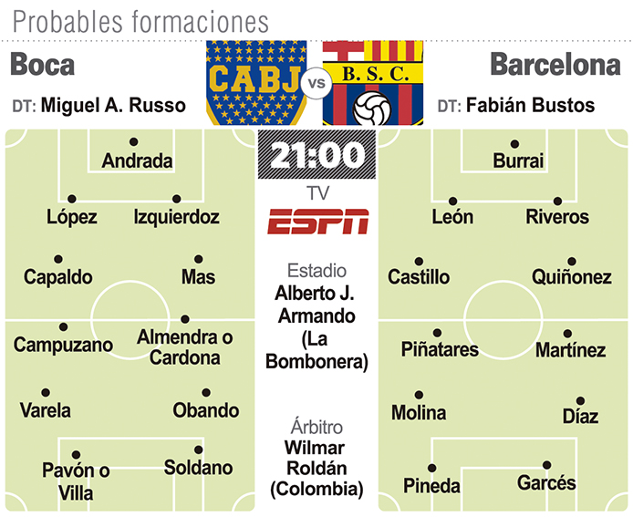 Boca, con el ánimo alto tras haber eliminado a River en el torneo doméstico el domingo último y con la presencia en el equipo titular del sanjuanino Emmanuel Mas, recibirá hoy a Barcelona de Ecuador por la Copa Libertadores con el objetivo de conseguir una victoria que le posibilite alcanzar el primer puesto del Grupo C.