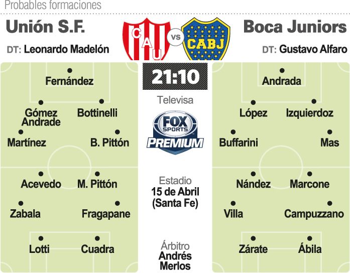 Boca Juniors será hoy visitante de Unión de Santa Fe, en uno de los encuentros de la 21ra fecha de la Superliga Argentina de Fútbol (SAF). El partido se desarrollará en el estadio 15 de Abril de la capital santafesina, a las 21.10, con arbitraje de Andrés Merlos y transmisión de Fox Sports Premium. Boca se posiciona tercero en la Superliga, con 38 puntos y a 10 del líder Racing Club con solamente 15 en juego, y ocupa una plaza para la Copa Libertadores de América 2020.