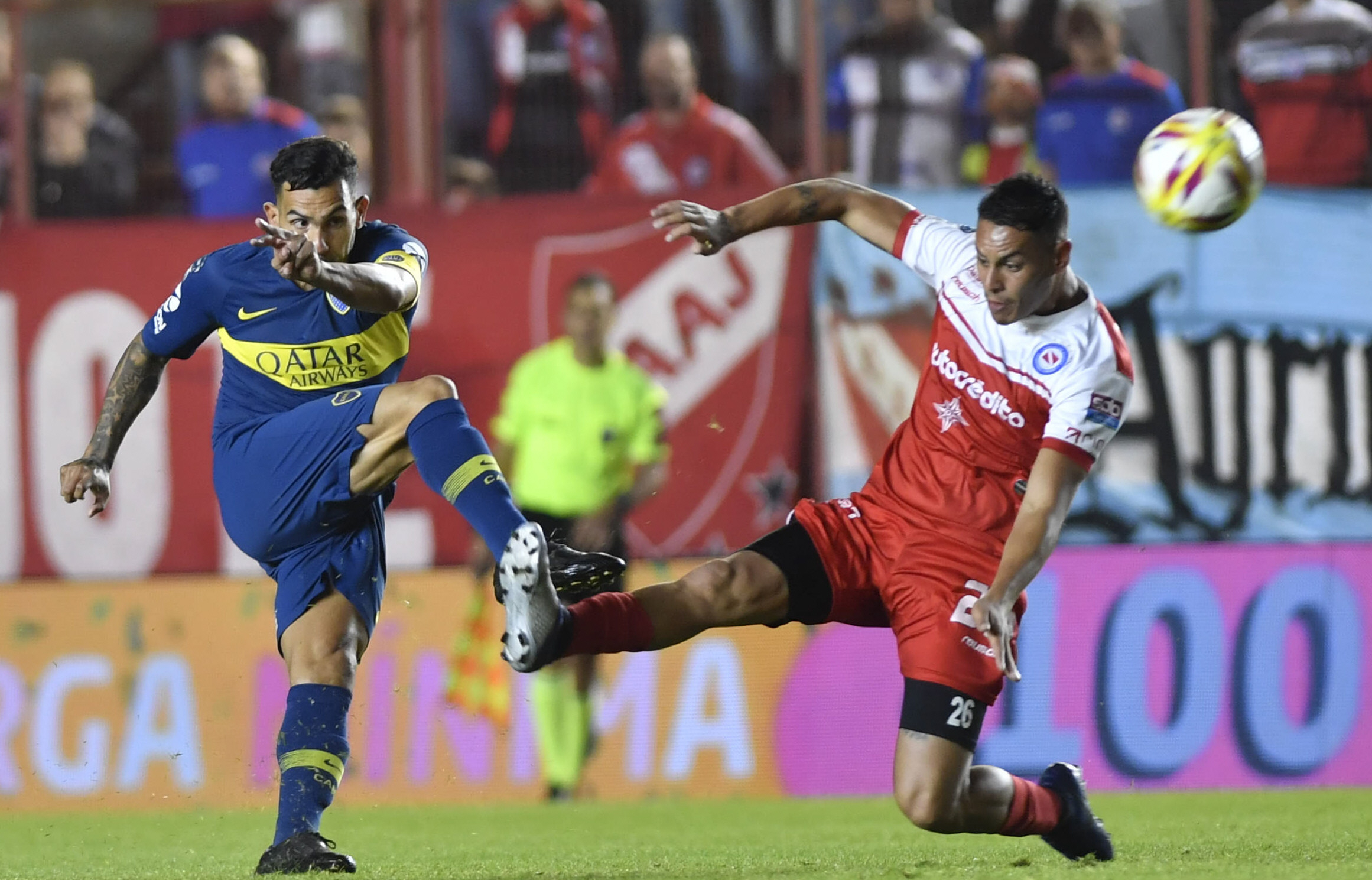 Carlos Tevez dispara al arco mientras Matías Romero intenta impedir que el tiro termine en gol. Al final Argentinos y Boca finalizaron en cero en La Paternal y dejaron la definición para el partido de vuelta.
