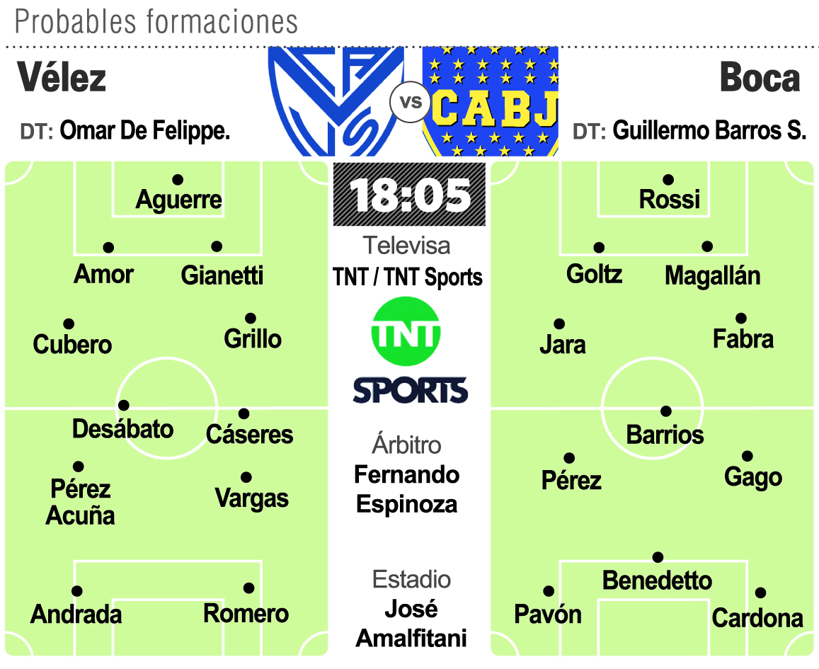 En Liniers, Boca (9 puntos) repetirá su formación de las tres fechas anteriores ante Vélez (7). Será el cruce entre el equipo más goleador y un rival que todavía no recibió goles, uno de los partidos más atractivos que pudiera presentar la actualidad del fútbol argentino.
