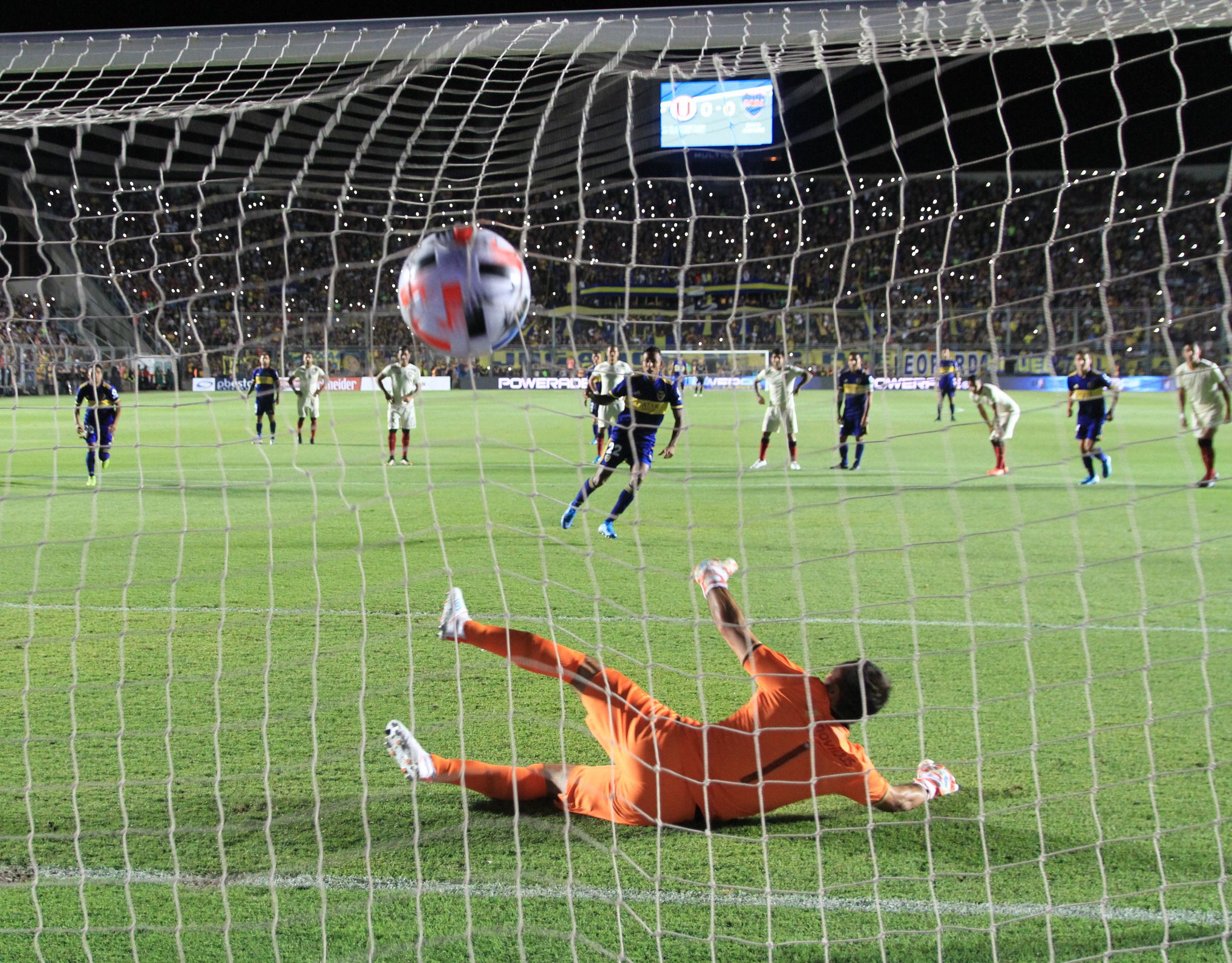 En la propuesta inicial, Russo sorprendió con un esquema de un volante central retrasado como Jorman Campuzano, otra línea de tres volantes más ofensivos con Salvio por derecha, Bebelo Reynoso suelto y Villa por la izquierda, Tevez flotando y Soldano de punta. Ofensiva pero tal vez sin el trabajo necesario como para poder generar el juego que este nuevo Boca quiere. Le costó acomodarse ante la presión de Universitario que le quitó la pelota en los primeros 15" de juego aunque sin complicaciones defensivas. Pero bastó que apareciera la categoría de Salvio en un desborde y Boca llegó. No pudieron empujarla pero creció el peso ofensivo. Se hizo parejo el juego, pero sin demasiadas luces y a los 37" Frank Fabra no pudo definir cómodo ante Carvallo cuando Soldano lo había dejado mano a mano.