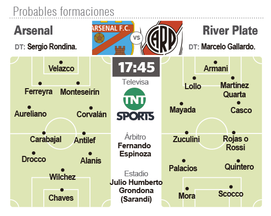 River Plate, que viene de conseguir su primer triunfo en la Copa Libertadores, buscará hoy su sexta victoria seguida en la Superliga Argentina cuando visite al ya descendido Arsenal en Sarandí, por la 24ta. fecha. Arsenal y River jugarán desde las 17:45 en el estadio Julio Humberto Grondona, con el arbitraje de Fernando Espinoza.