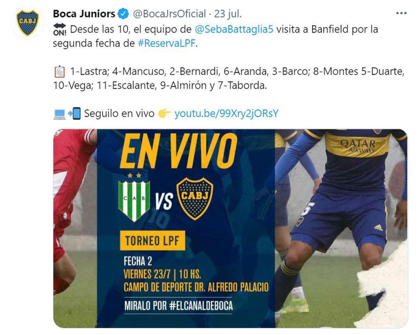 Esta escena provoca que Boca, que será dirigido por Sebastián Battaglia porque Miguel Russo está aislado con el resto del plantel, presentará ante Banfield un equipo con prácticamente los mismos jugadores que ayer le ganaron 3 a 1 al Taladro en la División Reserva.