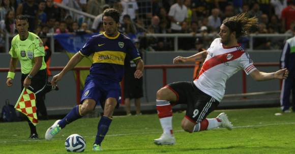 Boca largó mucho mejor el superclásico. El equipo de Carlos Bianchi estuvo más rápido y preciso en los minutos especiales del partido. Así, a los 19’ estuvo cerca de abrir el marcador con un cabezazo de Gigliotti que exigió la respuesta de Barovero. Pero a los 19’ poco pudo hacer el arquero debido al preciso zurdazo de tiro libre por parte de Sánchez Miño, que de esa manera abrió el marcador. La desventaja en el resultado provocó una reacción del Millonario. De a poco salió de la presión que ejercían los volantes rivales y comenzó a generar riesgo sobre el arco de Orion. A los 24 Carbonero se perdió la igualdad al cabecear muy alto un córner, a los 39’ Cavenaghi casi grita, aunque su zurdazo salió apenas desviado. Pero a los 41, llegó la paridad con un anticipo de Maidana a Orion que puso el 1-1 parcial. En el descuento se dio la expulsión del Cata Díaz por insultar al árbitro y así Boca se fue al descanso con mayor preocupación.