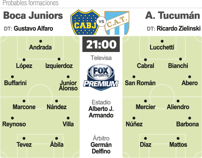 Tevez ingresará por Mauro Zárate y los otros cambios respecto del equipo que viene de ganarle por 2-1 a Lanús serán: Junior Alonso por Emmanuel Mas, Nahitán Nández por Jorman Campuzano, Emanuel Reynoso por Agustín Almendra, Sebastián Villa por Cristian Pavón y Ramón "Wanchope" Ábila por Darío Benedetto.