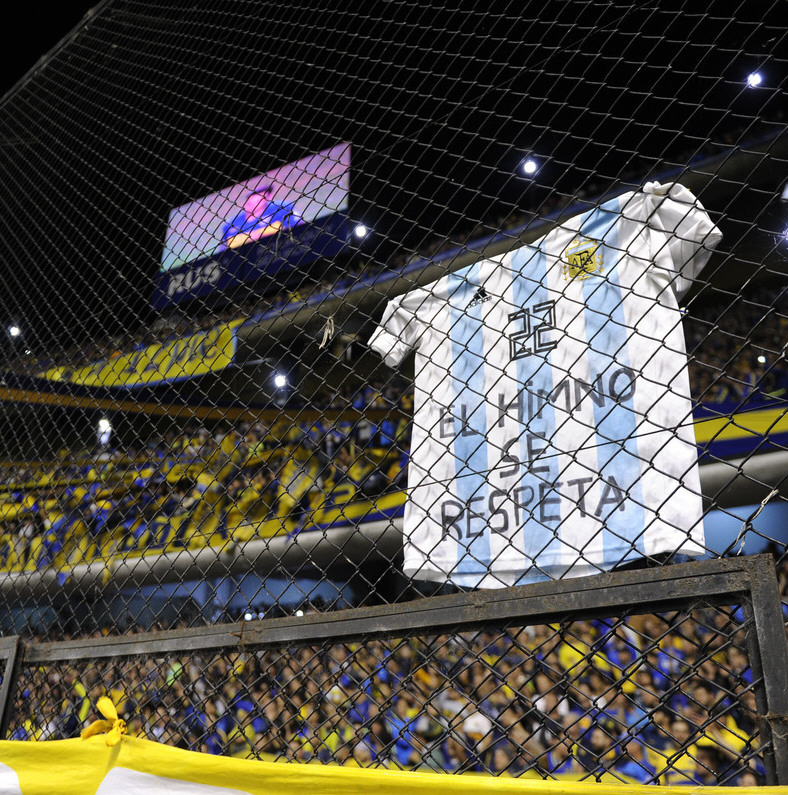 En el alambrado de la Bombonera, también, colgaron una remera de la Argentina que decía "El himno se respeta" (foto), en relación al cantito de "traidor" que retumbó en Liniers en la semifinal de ida el domingo anterior mientras sonaba el Himno Argentino.
