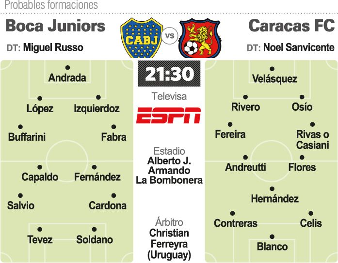 El promisorio juvenil Capaldo reemplazará a una de las figuras de Boca, el colombiano Campuzano, a quien Russo preservará porque tiene dos tarjetas amarillas y de sumar otra se perderá el cruce de ida de los octavos de final, que se sortearán en Luque, Paraguay, mañana al mediodía.