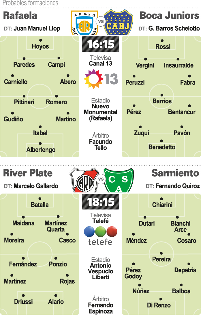 Boca irá por un triunfo que le de tranquilidad en una fase clave del torneo para seguir con una buena ventaja y presentará una variante, con respecto a los que actuaron frente a Patronato: Fernando Zuqui por Nazareno Solís. En tanto, Rafaela, último en los Promedios, necesita ganar para mantener alguna esperanza por la permanencia.