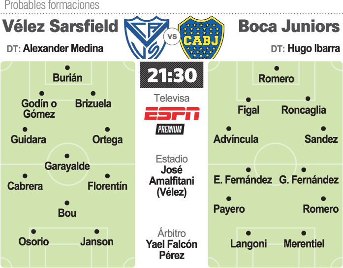Boca Juniors, el actual campeón del fútbol argentino, asumirá un compromiso de riesgo cuando visite hoy a Vélez Sarsfield, en el partido saliente de los cuatro que le darán continuidad a la quinta fecha de la Liga Profesional de Fútbol (LPF). El encuentro se jugará este sábado a partir de las 21.30 en el estadio José Amalfitani, de Vélez, ubicado en el barrio porteño de Liniers, será arbitrado por Yael Falcón Pérez y televisado por la señal ESPN Premium. El equipo "Xeneize" tiene 7 puntos en el inicio de la Liga Profesional y viene de superar a Platense como local por 3-1, mientras que Vélez, con 5 unidades, empató en Tucumán (1-1) con el local Atlético un partido que tenía casi ganado.