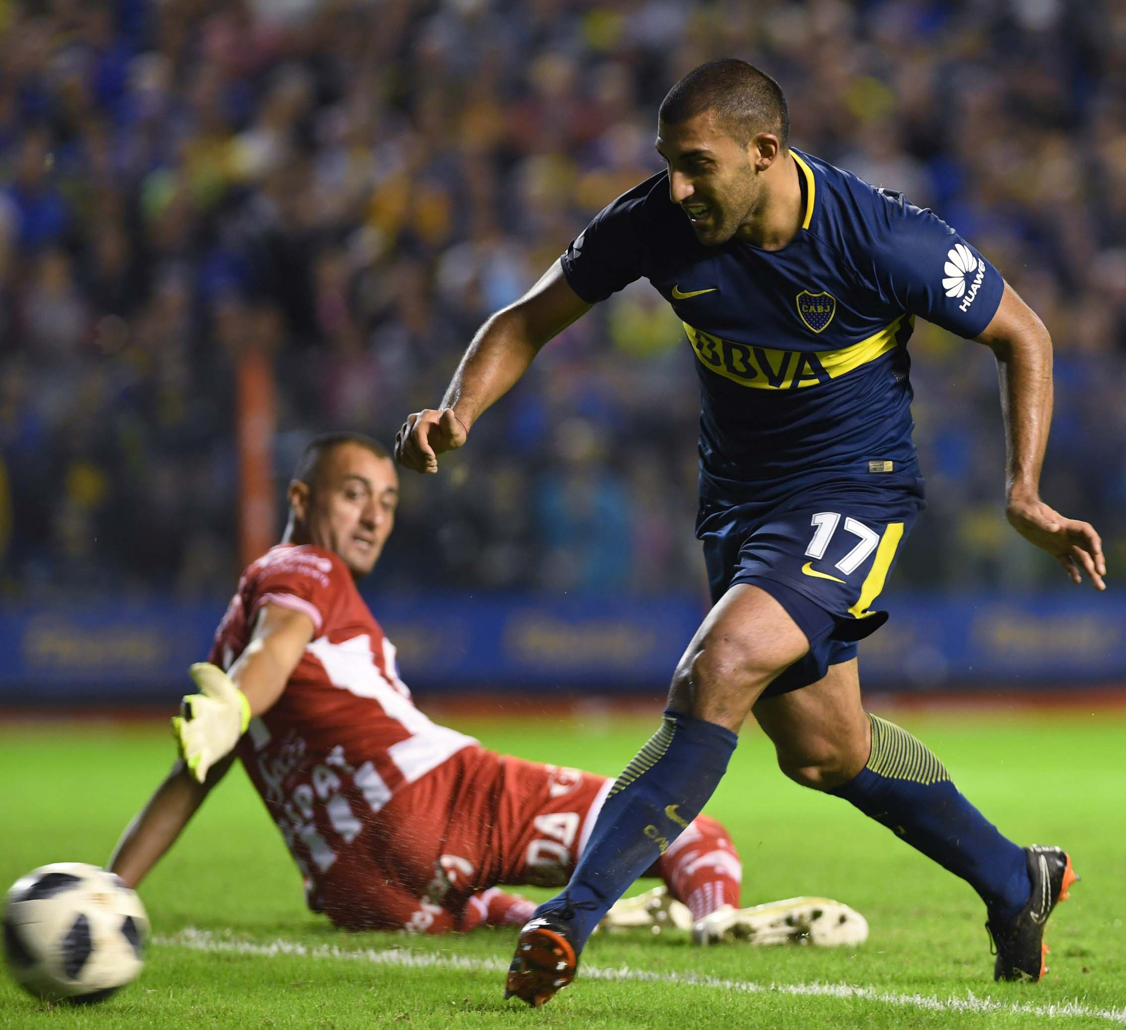 Desahogo. Ramón Ábila toca de zurda el balón para abrir el marcador en la Bombonera. Wanchope resultó la gran figura en el triunfo clave de Boca.