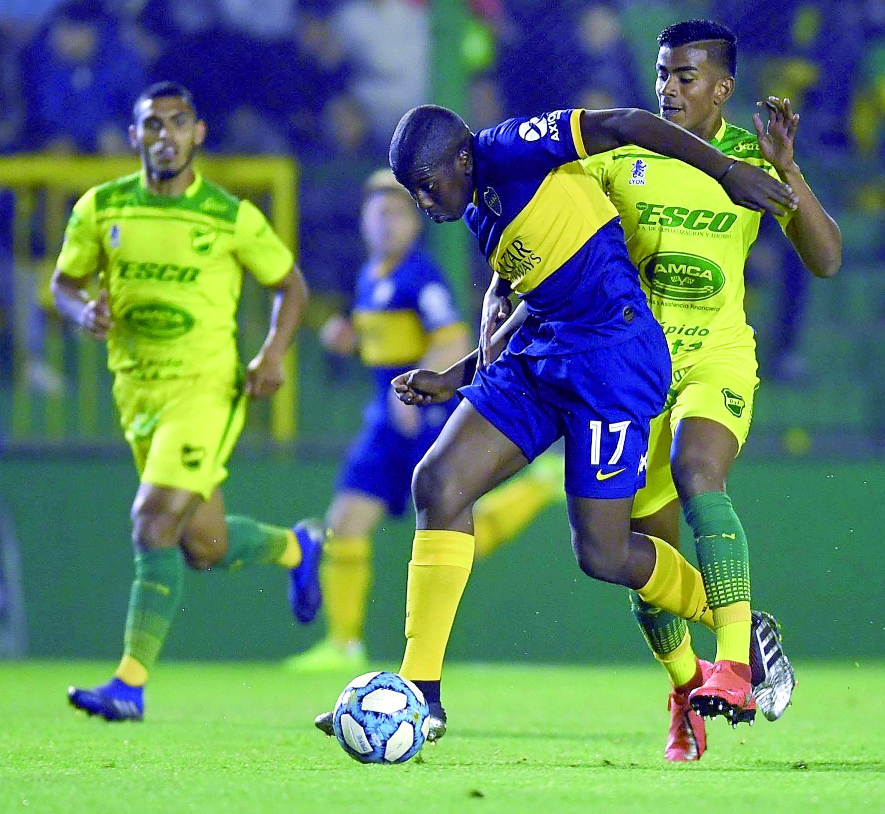 Aguanta. Jan Hurtado, delantero de Boca, resiste a la presión del contrario de Defensa. En Varela, el líder volvió a sonreír.
