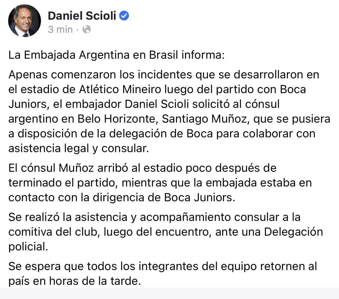 “Apenas comenzaron los incidentes que se desarrollaron en el estadio de Atlético Mineiro luego del partido con Boca Juniors, el embajador Daniel Scioli solicitó al cónsul argentino en Belo Horizonte, Santiago Muñoz, que se pusiera a disposición de la delegación de Boca para colaborar con asistencia legal y consular.