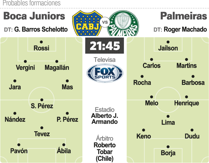 Barros Schelotto realizará dos cambios respecto del equipo que el último fin de semana le ganó a Newell”s por 3-1, que lo dejó a un paso del bicampeonato en la Superliga. El sanjuanino Emmanuel Mas ingresará por el colombiano Frank Fabra en el lateral izquierdo de la defensa y Pablo Pérez reemplazará a Emanuel Reynoso en la mitad de la cancha. El Mellizo además cambiará el dibujo táctico: pasará del 4-2-3-1 utilizado ante Newell”s al 4-3-1-2, con Carlos Tevez como nexo entre los mediocampistas y los delanteros. Si Boca gana tomará todavía más valor el empate agónico de la semana pasada con Palmeiras en el Allianz Parque de San Pablo.