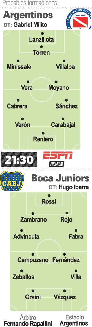 Tras el triunfo 1-0 del sábado en La Bombonera contra Talleres, el entrenador cambiará a un 4-4-2 con Exequiel Zeballos y Sebastián Villa por las bandas para asistir a los centrodelanteros Nicolás Orsini y Luis Vázquez.