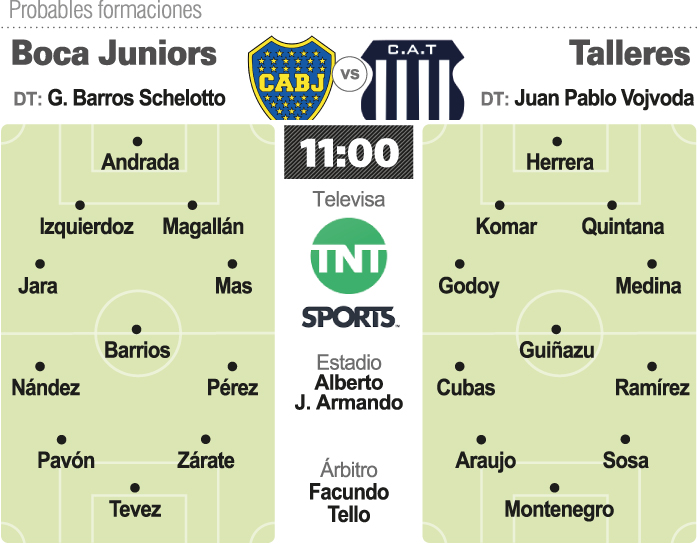 Tres variantes y cambio de esquema meterá Guillermo Barros Schelotto de cara al comienzo de la Superliga. Al equipo ingresarán Nahitan Nández, Carlos Izquierdoz y Carlos Tévez y pasará a jugar con tres volantes en el medio para un 4-3-3. Andrada, que ya había reemplazado a Agustín Rossi en la Libertadores, seguirá en el arco mientras que Izquierdoz (ingresa por Goltz) hará su estreno en la defensa, el uruguayo Nández ingresará para buscar más equilibrio en el medio por Cardona y Tévez entrará como centrodelantero por Wanchope Ábila.