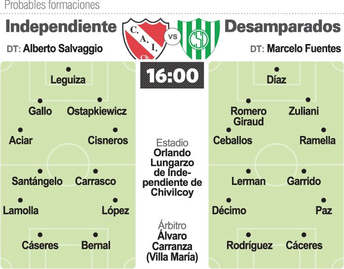 Por su parte, Desamparados se jugará una de sus últimas cartas para alimentar las chances de meterse en la pelea cuando visite a las 16 a Independiente de Chivilcoy con arbitraje de Alvaro Carranza de Villa María. Sportivo quiere terminar con esa racha negativa de diez partidos sin poder ganar y eso intentará hoy. Marcelo Fuentes hará tres variantes de cara a los que vienen de igualar ante Estudiantes de San Luis: Cristian Romero Giraud ya cumplió la fecha de suspensión y reemplazará a Callejas, en tanto que por el expulsado Márquez jugará Darío Ramella y Federico Paz volverá a la titularidad en reemplazo de Mateo Rodríguez. Desamparados quiere que sea en Chivilcoy donde despierte el equipo que se armó pensando en ser candidato. Sabe que si hoy no lo consigue, el camino quedará muy complicado en las siete fechas que restarán.