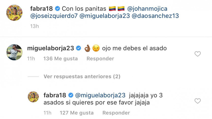 Sí, el delantero colombiano aprovechó un posteo de Frank Fabra en su cuenta de Instagram para demandarle que le pagara el asado que, parece, le habían prometido si él hacía su parte.