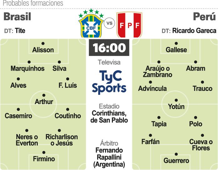 El seleccionado de Brasil, ganador del trofeo ocho veces y que suma 12 años sin obtenerlo, jugará hoy ante Perú, con la dirección técnica del argentino Ricardo Gareca, en un partido por la tercera fecha del Grupo A de la Copa América que se juega en seis ciudades brasileñas. El encuentro se jugará en el estadio Arena Corinthians, en la ciudad de Sao Paulo, desde las 16, con el arbitraje del argentino Fernando Rapallini y televisado por TyC Sports.