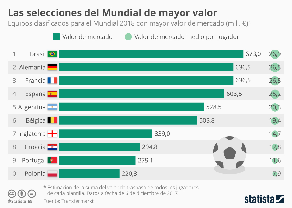 Luego figura el actual campeón del mundo, Alemania, Francia, España y en el quinto lugar aparece Argentina.