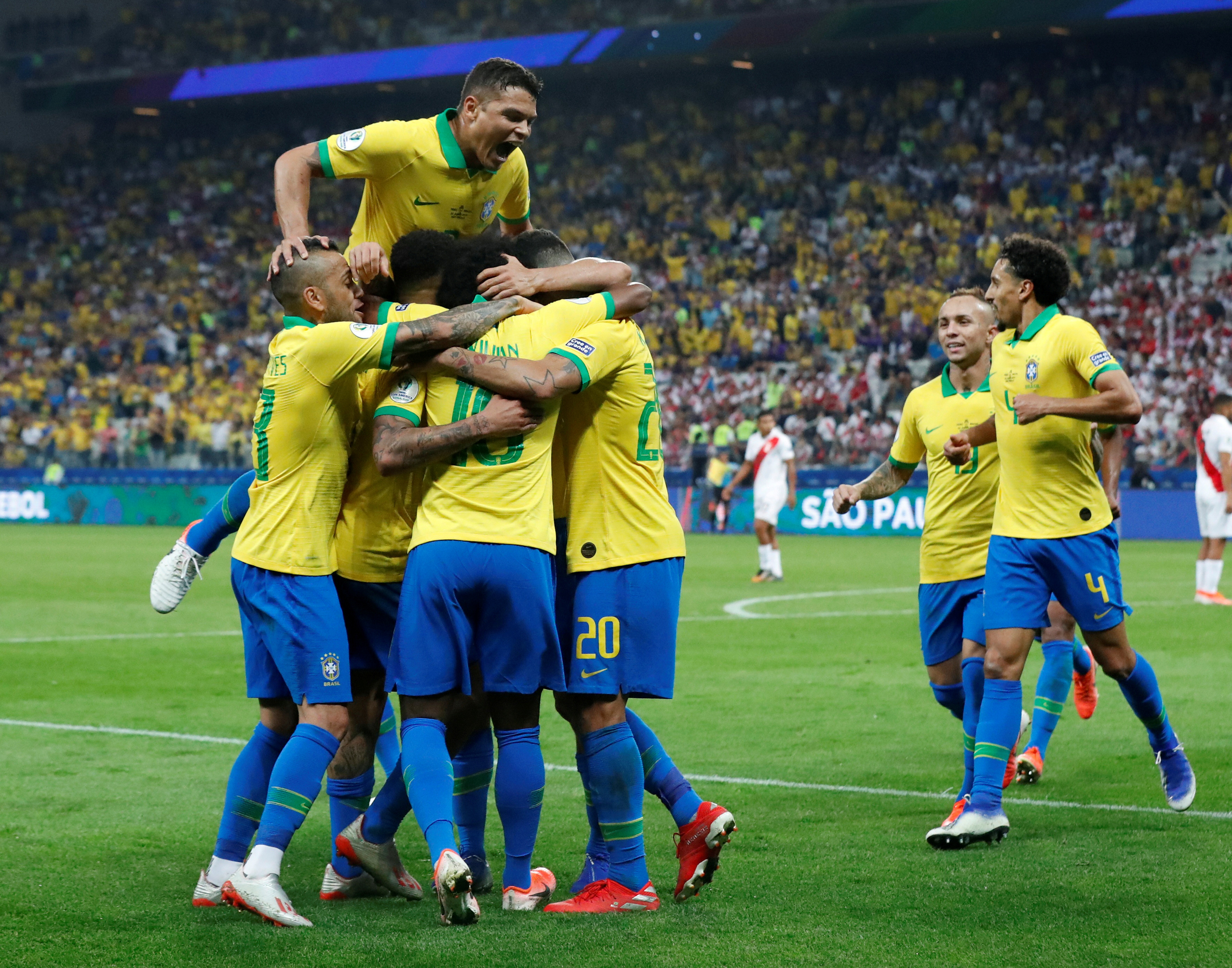 El seleccionado de Brasil goleó a Perú, dirigido por el argentino Ricardo Gareca, por 5 a 0 en un partido por la tercera fecha del Grupo A de la Copa América, y se clasificó en primer lugar a los cuartos de final. El abultado triunfo brasileño le facilita el camino a la Argentina, que de ganar su compromiso tiene abierto el camino para pasar a la siguiente ronda. Casemiro (12m.Pt), Roberto Firmino (19m.Pt), Everton (32m.Pt), Dani Alves (8m.St) y Willian (45m.St) marcaron los goles del encuentro jugado en el estadio Arena Corinthians, en la ciudad de San Pablo, con el arbitraje del argentino Fernando Rapallini. Dentro de un inicio parejo, Perú presionó bien en el medio, le sacó la pelota a su rival y llegó con un remate muy desviado desde afuera del área de Luis Advíncula. Pero en la primera llegada a fondo, el local abrió el marcador, tras un tiro de esquina de Marquinhos que conectó Casemiro de cabeza.