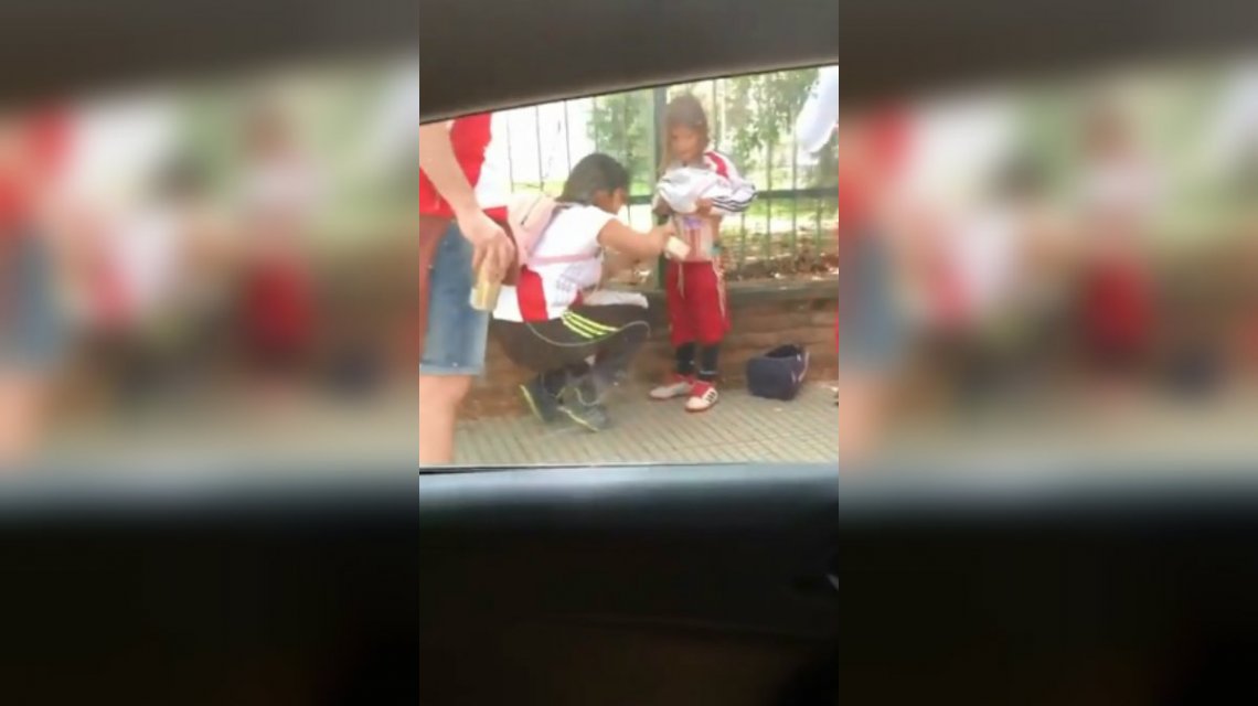 Todavía no está claro si el video es de este sábado, pero lo que sí se ve es una persona menor de edad que esconde bengalas debajo de su camiseta de River por decisión de una mujer que se las acomoda. El video fue tomado desde un auto en las inmediaciones del Tiro Federal.