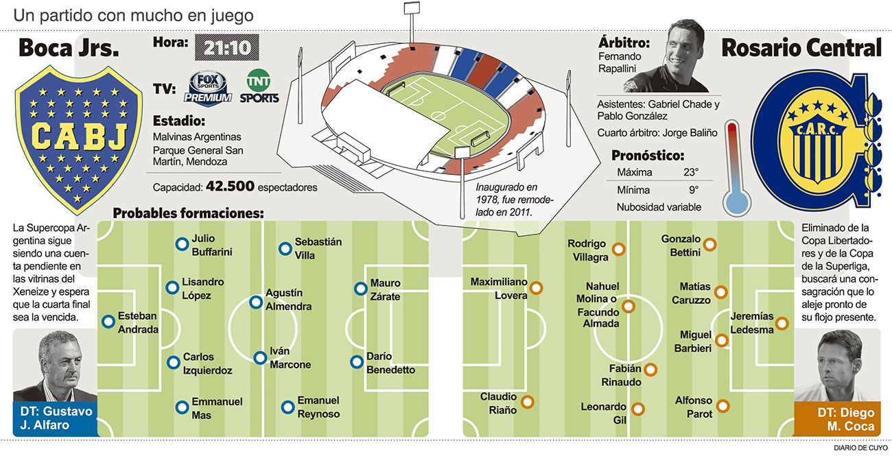 Boca y Rosario Central se enfrentarán hoy (21.10 horas) en Mendoza para definir al campeón de la Supercopa Argentina en un partido que promete un marco imponente y que tiene a los "xeneizes" como favoritos para lograr el primer título en el ciclo del entrenador Gustavo Alfaro. El encuentro se jugará a partir de las 21.10 en el estadio Malvinas Argentinas, de Mendoza, con público de ambos clubes, será arbitrado por Fernando Rapallini y televisado por la señal de cable TyC Sports.