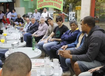 La gente que transitaba ayer al mediodía por el kilómetro cero de nuestra provincia se sorprendió con la escenografía en la vereda de un café: el plantel completo del tricampeón de la Liga Argentina de vóleibol, UPCN, más el cuerpo técnico encabezado por Fabián Armoa y el máximo responsable gremial, José Pepe Villa, en una charla más que amena con el gobernador, José Luis Gioja. Se trató de una reunión cordial y en la cual el principal mandatario felicitó a los Cóndores por su flamante coronación y a su vez les deseó suerte en el viaje que anoche realizó el equipo para disputar en Brasil el Sudamericano, desde el próximo miércoles.