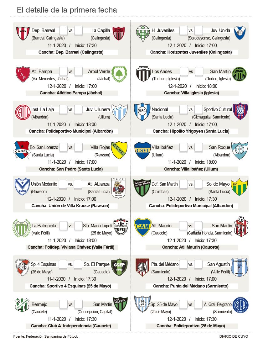 Pero el detalle zona por zona indica que el sábado habrá acción en Barreal, donde el Deportivo será local de Atlético La Capilla quedando para el domingo el choque en Calingasta entre Horizontes Juveniles y Sorocayense. El Grupo 2 irá todo el domingo con los clásicos de Iglesia entre Los Andes y San Martín y el clásico de Jáchal entre Pampa y Arbol Verde.