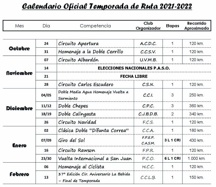 En tanto que la ‘Ruta’ verá bandera de salida el 24 de octubre y, entre las novedades, aparece una fecha de finalización temprana, allá por febrero. El plato fuerte, como de costumbre, será la Vuelta Internacional a San Juan, que se realizará entre el 23 y 30 de enero con 6 competencias en línea y una contrarreloj.