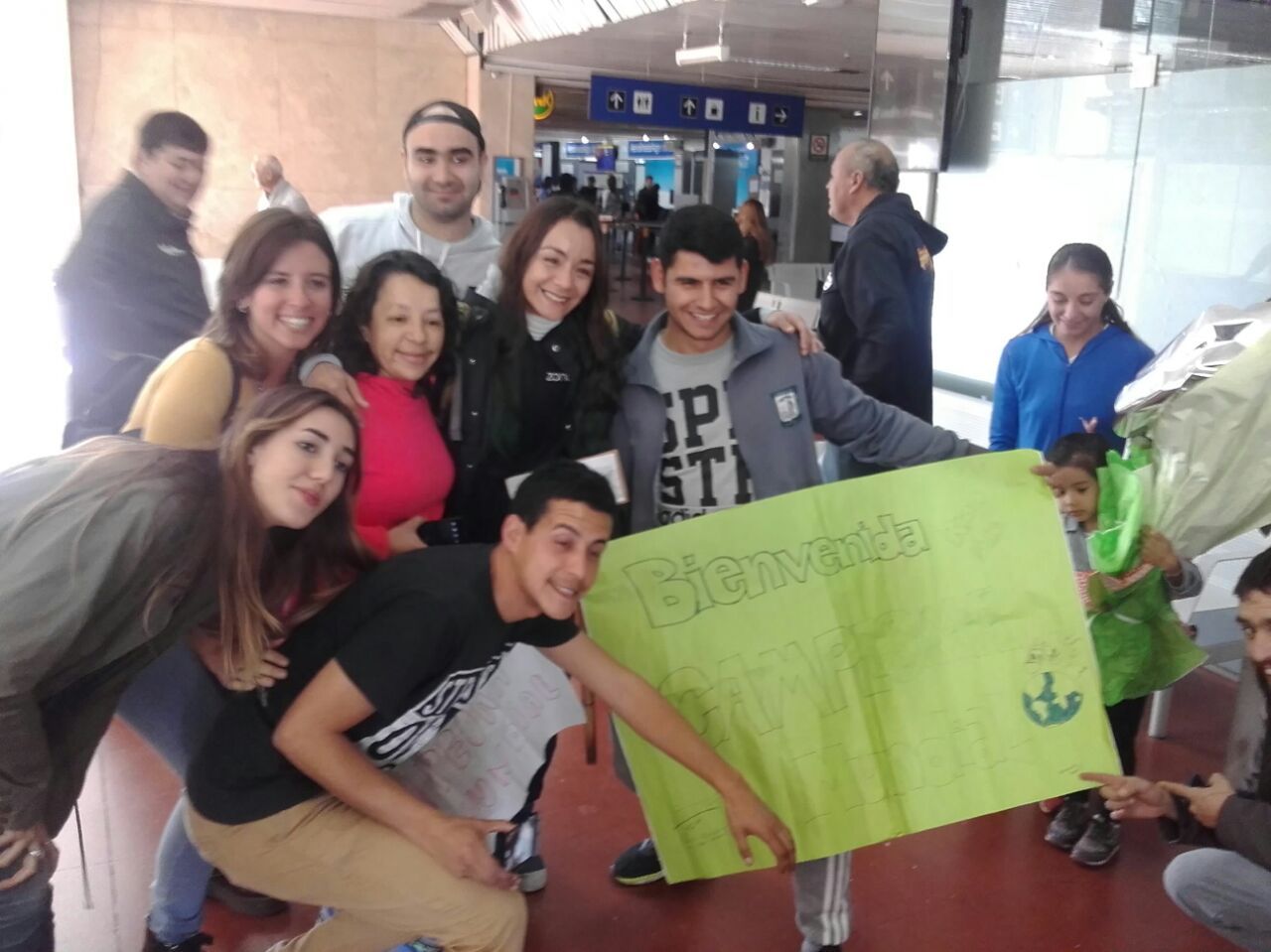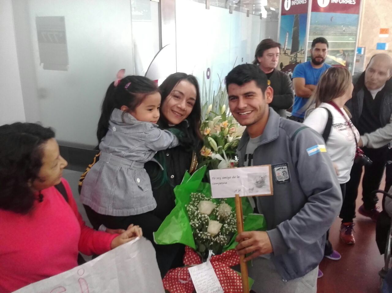 A la deportista la esperaban carteles de felicitaciones y abrazos acompañados de más de una lágrima de emoción de su familia.