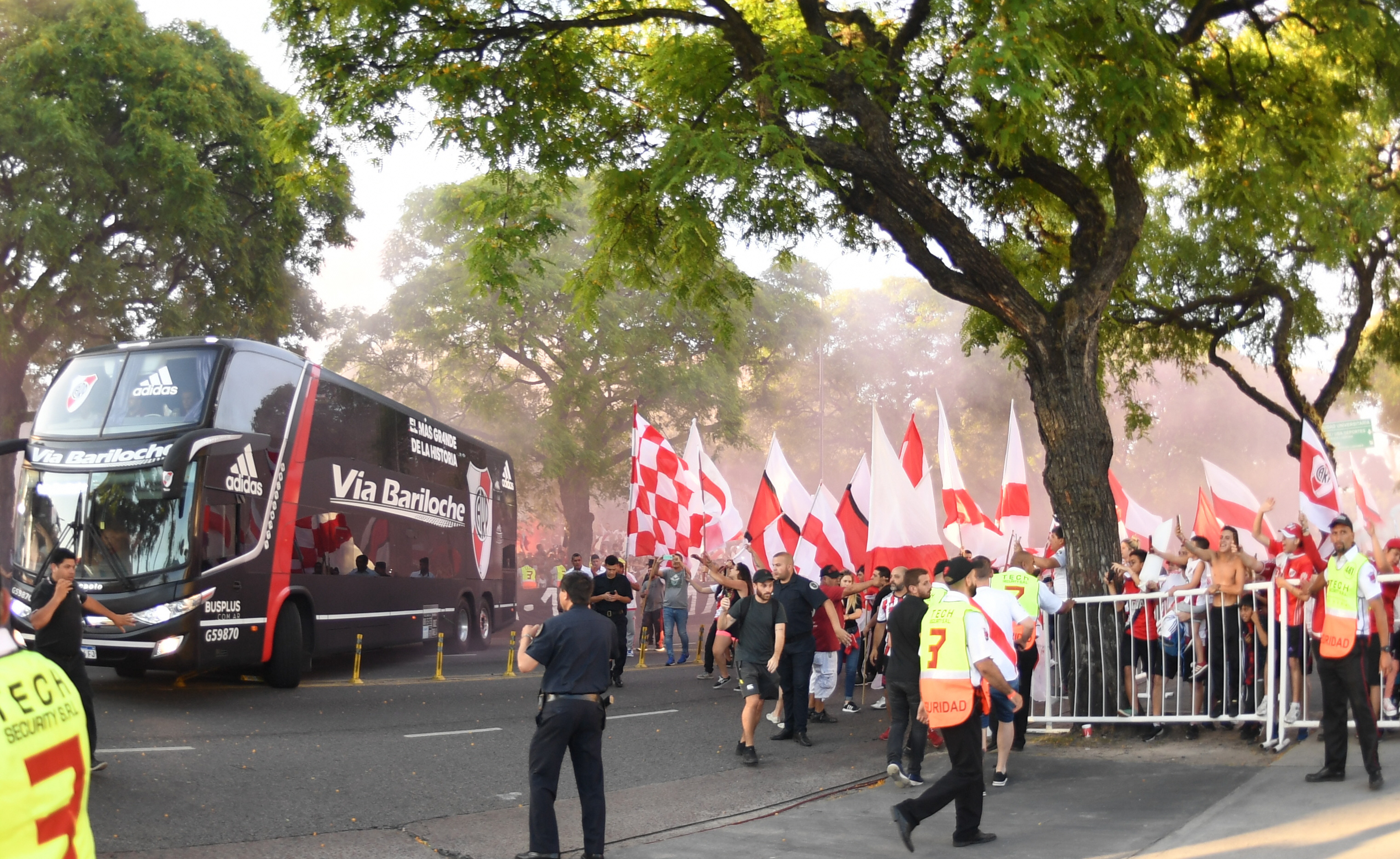 "Gracias y gloria eterna" decían muchas banderas que los hinchas hicieron flamear detrás de los vallados y los cordones policiales organizados para ordenar la llegada del micro, que se vio desbordada por los miles y miles de fanáticos que fueron al Monumental a acompañar el arribo del equipo que no pudo coronarse bicampeón de América por muy pocos minutos.