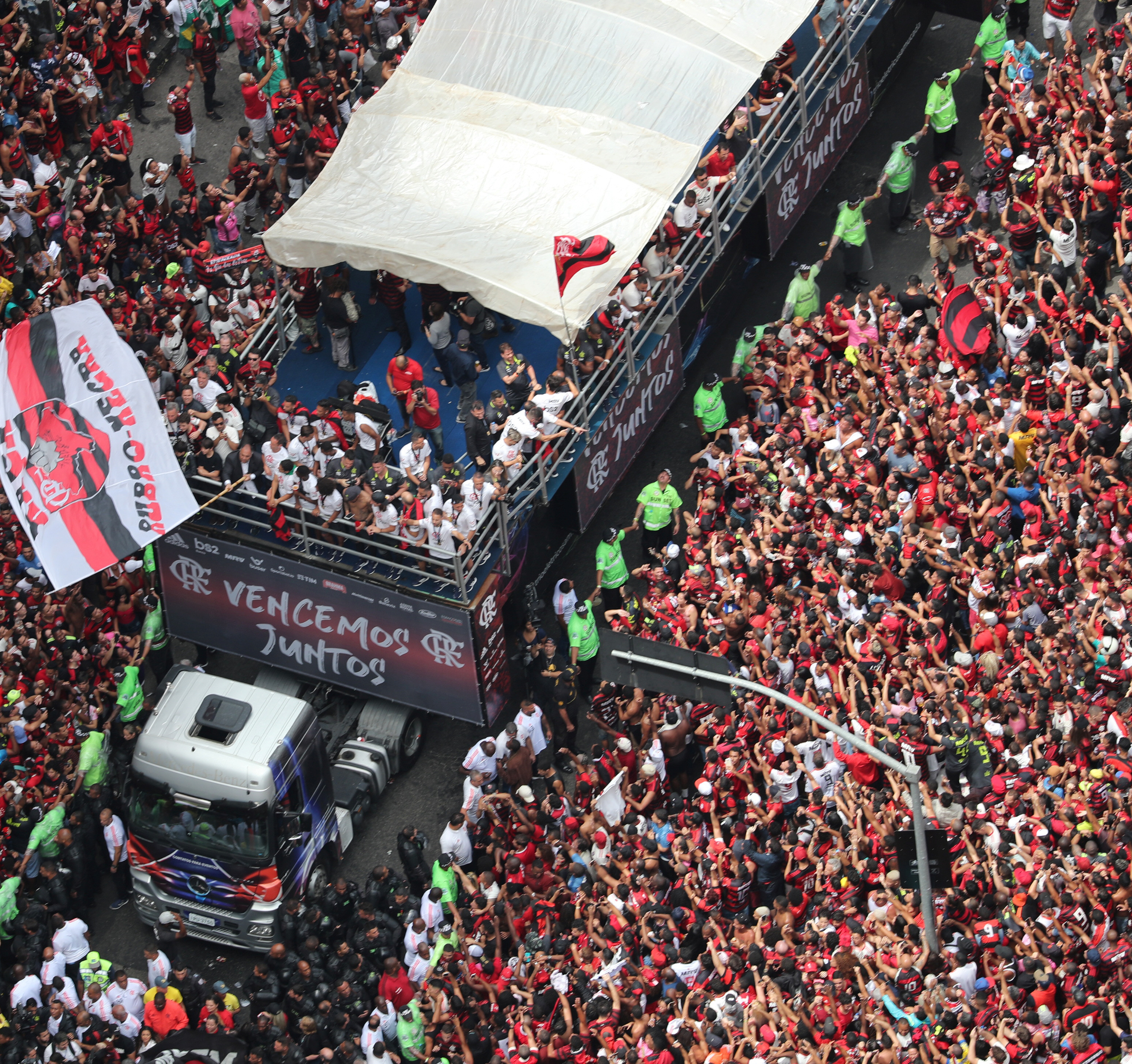 El plantel arribó a Brasil al mediodía y media hora después llegó a la plaza de la Iglesia de La Candelaria, donde se subió a un "trío eléctrico" para recorrer las calles de Río de Janeiro. El camión descapotable, que habitualmente se utiliza en el carnaval, inició la caravana por la tradicional Avenida Presidente Vargas con destino el Monumento de Zumbí dos Palmares, a paso de hombre, por una multitud de fanáticos que llenaron las calles para celebrar el título.