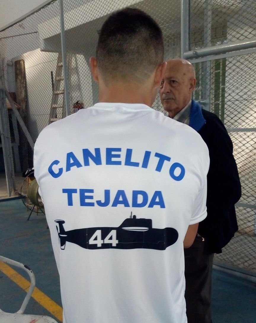 Vestido de jean y una remera blanca con el nombre de quien es su mayor sponsor: Waldino Acosta, en el pecho. Y con una imagen del submarino ARA San Juan, debajo de su identificación, por medio del apodo que le colocó el periodista Marcelo González: Canelito Tejada.