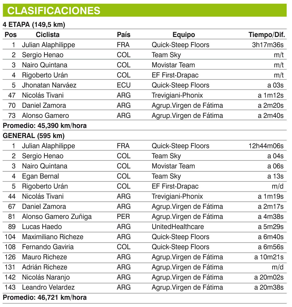 Con el sanjuanino Nicolás Naranjo (Agrupación Virgen de Fátima) entre los 20 fugados que aguantaron hasta el pie del puerto del Alto del Tambo, donde terminó la carrera 5 kilómetros más adelante, se completó ayer la cuarta etapa de la “Colombia Oro y Paz” que tuvo como ganador a otro hombre del Quick-Steep Floors, el francés Julian Alaphilippe, quien se convirtió en el nuevo malla líder de la carrera, desplazando a su compañero de equipo, el colombiano Fernando Gaviria, quien ayer junto a los otros embaladores de su conjunto, Maximiliano Richeze y Álvaro Hodeg, dio vida a la escapada que peleó todas las bonificaciones intermedias y después, como le pasó a Naranjo, perdieron gran cantidad de tiempo con respecto a quienes pelearán la general en las dos etapas que faltan.