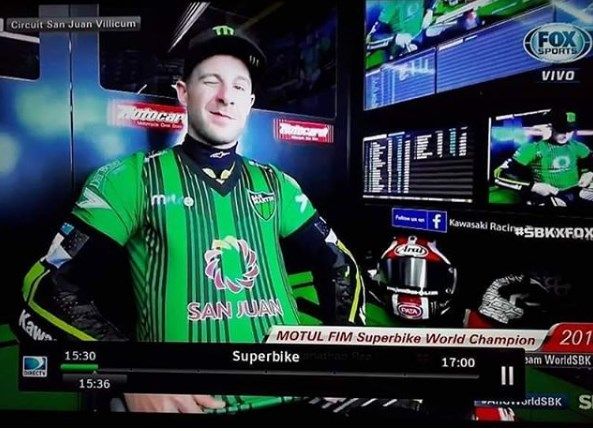 Jonathan Rea, piloto de Kawasaki Racing Team WorldSBK, quien se consagró campeón en el Autódromo El Villicum, se mostró en la televisión con la camiseta de San Martín.