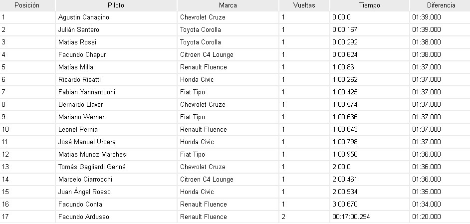 Más atrás se ubicaron Fabián Yannantuoni (Fiat), Bernardo Llaver (Chevrolet), Mariano Werner (Fiat), Leonel Pernía (Renault) y Facundo Chapur (Citroën).