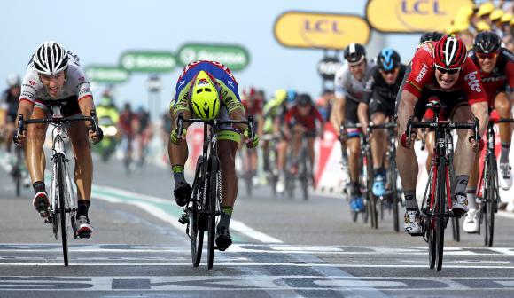 En el pelotón estaba el último ganador del Tour, Vincenzo Nibali (Astana), el colombiano Nairo Quintana (Movistar) y el francés Thibaut Pinot (FDJ), que sólo pudo intentar limitar los daños después de quedar cortado en la parte trasera. Greipel fue el más rápido en la recta final, superando al eslovaco Peter Sagan (Tinkoff Saxo) y a Fabian Cancellara (Trekk), que llegó tercero y se llevó el maillot amarillo de líder. El británico Mark Cavendish (Ettix QuickSteep), favorito para ganar la etapa antes de comenzar, sólo pudo terminar en un decepcionante cuarto puesto.