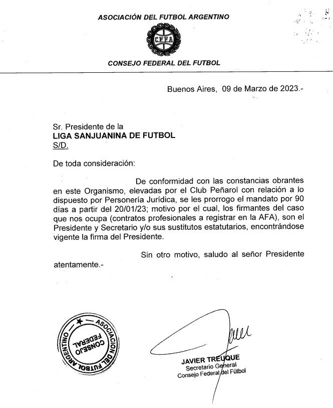 Según el artículo que habla de las funciones del presidente, para la firma de convenios o contratos dice lo siguiente: "En todos los casos, la sola firma del Presidente no será válida si la misma no es refrendada por el Secretario General". En otras palabras, la firma de Cuevas sin la del secretario no le alcanzaba y fue por ese motivo que el miércoles por la tarde cuando Cuevas se presentó en la sede de la Liga Sanjuanina de Fútbol, desde ese ente no le aceptaron la lista de buena fe. Así lo afirmó José Campos (vicepresidente de la LSF) ese mismo miércoles en Radio La Voz. Pero el mandamás de la Liga no se dio por vencido y agotó todas las instancias, llegó al Consejo Federal como también lo hizo Luis Varela, del otro lado de la Comisión.