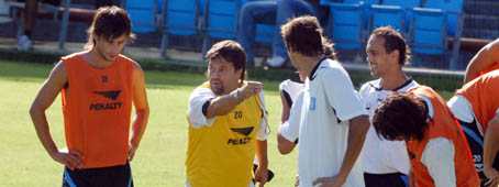 Durante la práctica el técnico de Racing dio muchas indicaciones, reclamándole a sus dirigidos que jueguen con las líneas bien cerca.