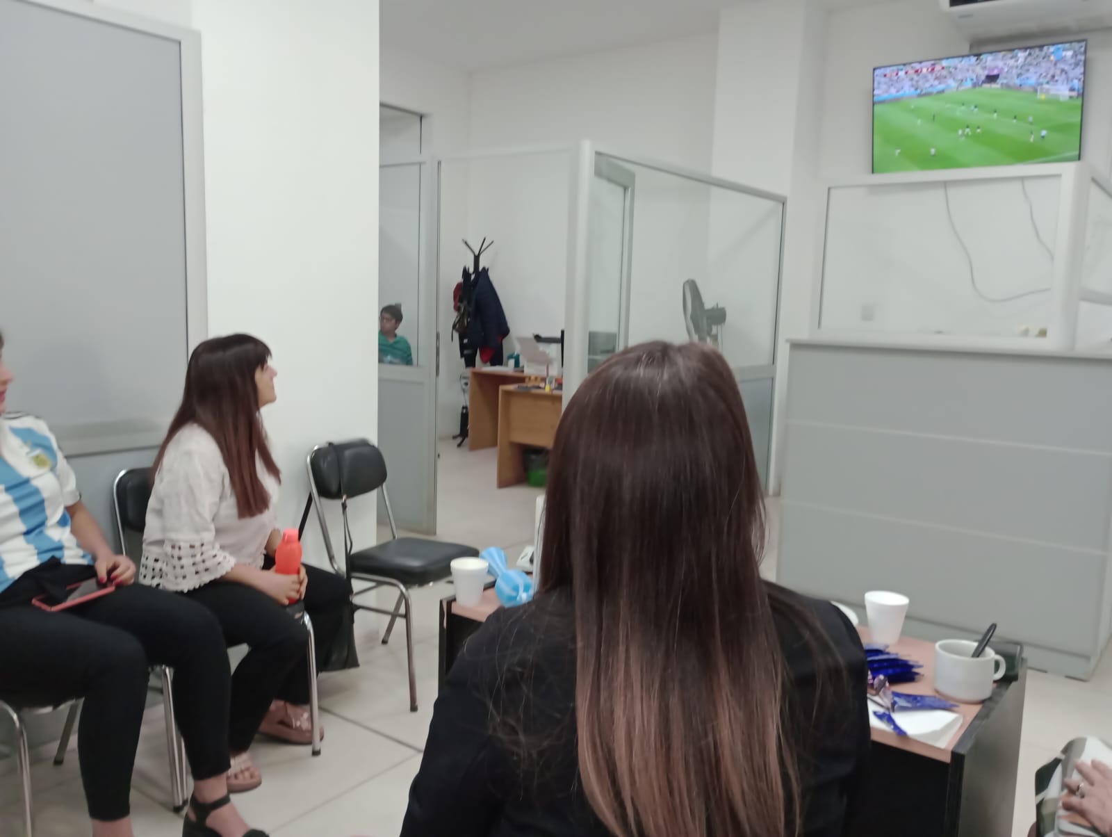 En la Defensoría del Pueblo, se vio gran cantidad de trabajadores con camisetas de Argentina sentados frente al televisor. No faltaron el mate y las tortitas. Al tiempo que, los empleados del Juzgado de Niñez y Familia ocuparon los asientos que normalmente usan quienes van a hacer trámites para sentarse frente al televisor.