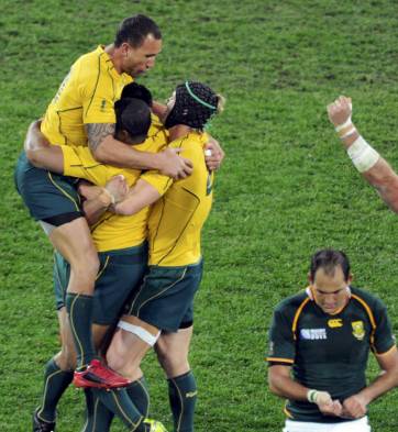 El choque entre los Wallabies y los Springboks fue parejo y cerrado, como se preveía, y se resolvió a favor de Australia a ocho minutos del final para poner a Australia entre los 4 mejores. Sudáfrica no podrá así defender la corona obtenida en el Mundial pasado, que se celebró en Francia en 2007.